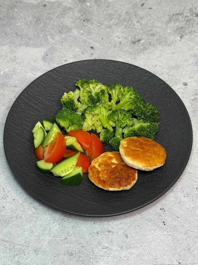 Брокколи, 2 куриные котлетки, свежие овощи (томат и огурец).