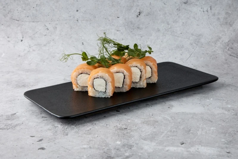 Сливочный сыр, лосось, рис, нори. Соевый соус/имбирь/васаби/палочки не входят в стоимость.