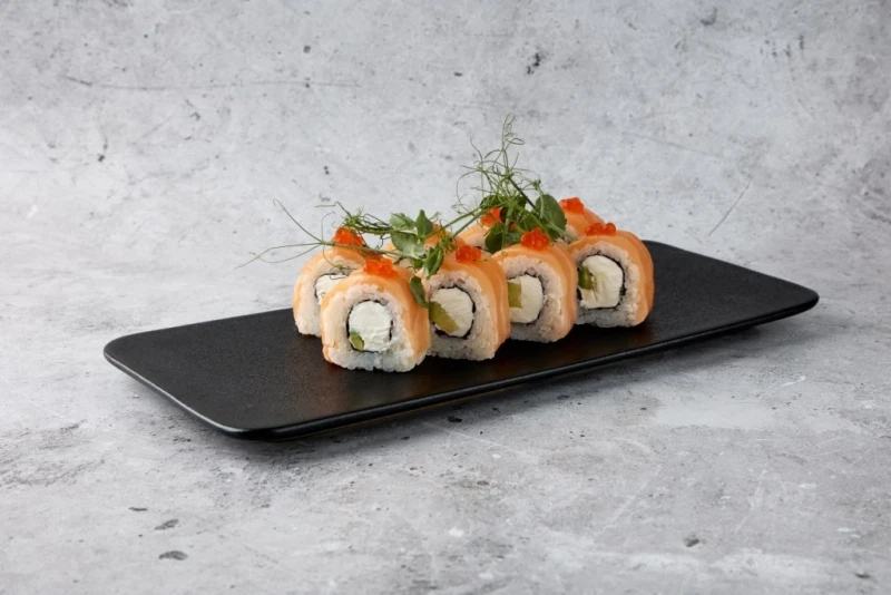 Сливочный сыр, лосось, авокадо, рис, нори. Соевый соус/имбирь/васаби/палочки не входят в стоимость.