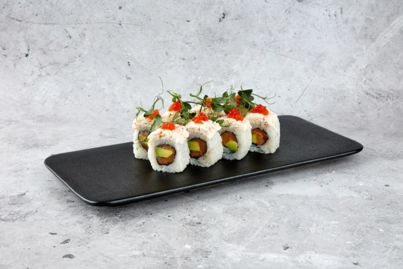Лосось, авокадо, соус из нежного краба, икра лосося, рис, нори. Соевый соус/имбирь/васаби/палочки не входят в стоимость.
