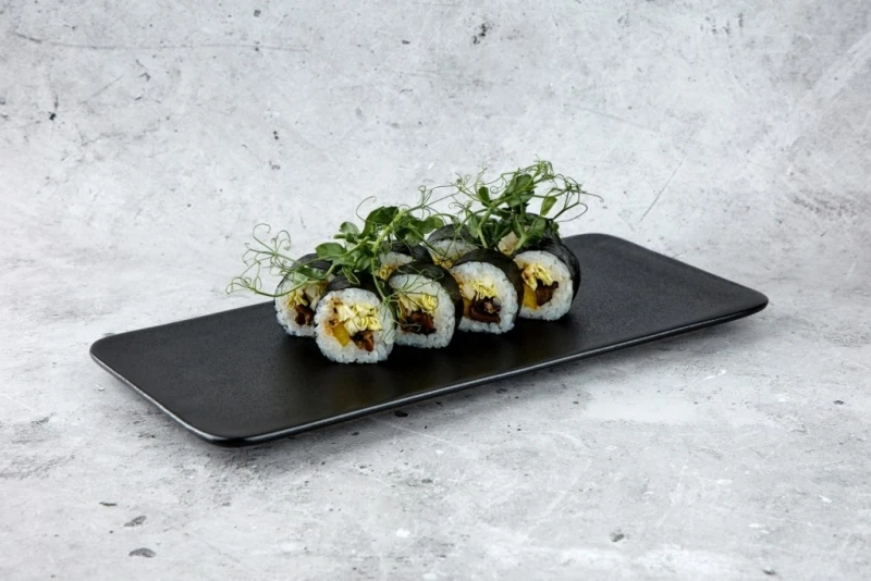 Грибы шиитаке, болгарский перец, пекинская капуста, соус кимчи, соус унаги, кунжут, рис, нори. Соевый соус/имбирь/васаби/палочки не входят в стоимость.